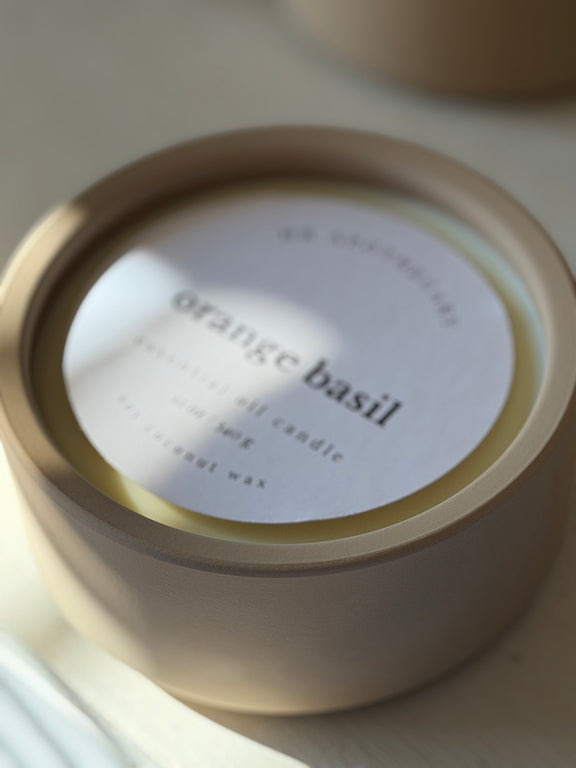 Soy coconut wax, sweet orange essential oil, basil essential oil, frankincense essential oil, lead-free cotton wick.